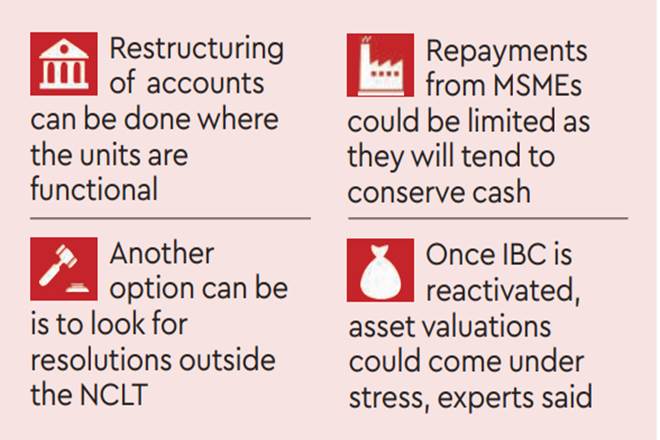 With the insolvency law remaining out of bounds for a year, banks are pinning their hopes on a regulatory dispensation for restructuring stressed assets. An existing restructuring scheme for micro, small and medium enterprises (MSMEs) could also come in handy in a year that will have little to offer in terms of recoveries, bankers said.
