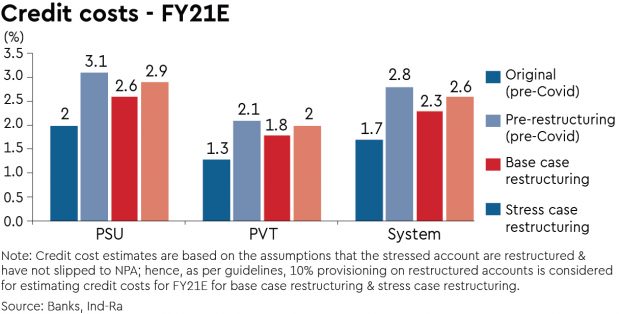 India Ratings expects the provisioning requirement to fall by around 10% on the restructured pool in FY21 from earlier expectations on loans that could have turned bad. “As the tenor for the restructured loans can be extended for a maximum of two years, the credit cost impact in accounting terms could be benign in FY21 and FY22,” the agency said.