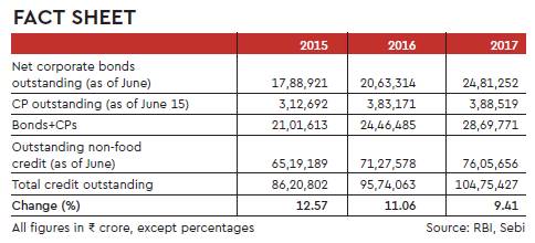 The net corporate bonds outstanding, as at the end of June, was Rs 24.81 lakh crore, up 20% from Rs 20.63 lakh crore in June 2016, as per the latest data released by Sebi. Data from the RBI showed that the net outstanding on commercial papers stood at Rs 3.88 lakh crore as of June 15, little changed from Rs 3.83 lakh crore in the previous year. Outstanding non-food bank credit grew 6.7% y-o-y to Rs 76.06 lakh crore as on June 23.