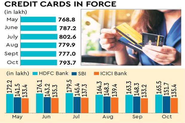 The number of active credit cards of all banks put together improved by 2.1% in October to 793.7 lakh from 777.02 lakh in the previous month, as per RBI data. HDFC Bank, the market leader in the credit card space, added 2.2 lakh cards in October, while State Bank of India and ICICI Bank added 3.4 lakh and 2.2 lakh cards, respectively. These three banks together account for 57% of the credit cards in the system.