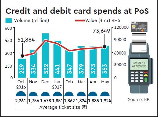 At close to Rs 74,000 crore, credit and debit card spends at point-of-sale (PoS) terminals may have stabilised at levels that are about 40% higher than they were pre-demonetisation, suggests data from the Reserve Bank of India (RBI) website. Card spends in May added up to Rs 73,649 crore, up 42% from Rs 51,884 crore in October, and 25% higher than Rs 58,734 crore in November. However, in no month so far have spends come close to the December peak of Rs 89,180 crore. Moreover, ticket sizes are trending down, suggesting cards are being used for smaller transactions too; from Rs 2,261 in October, they are currently at Rs 1,924. Nevertheless, they are above the December lows of Rs 1,678. For whatever reason, cards aren’t being used to pay for groceries or even at restaurants, except perhaps at very high-end eateries. Even when the shortage of cash was acute, the average ticket size was Rs 1,500.