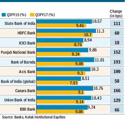 Another large lender from the public sector, Canara Bank, came close to transmitting the entire 175 bps of cuts through its yields. The bank’s yield on advances fell 166 bps during the two years under review to 9.1%. Punjab National Bank has seen the yield drop 152 bps to 8.34% at the end of December 2016.