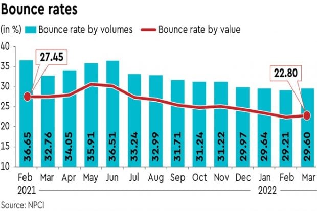 The share of failed auto-debit requests on the National Automated Clearing House (NACH) platform rose marginally to 29.6% in volume terms in March 2022, up 40 basis points (bps) from the previous month. In value terms, the bounce rate stood at 22.8%, up 36 bps from February 2022.