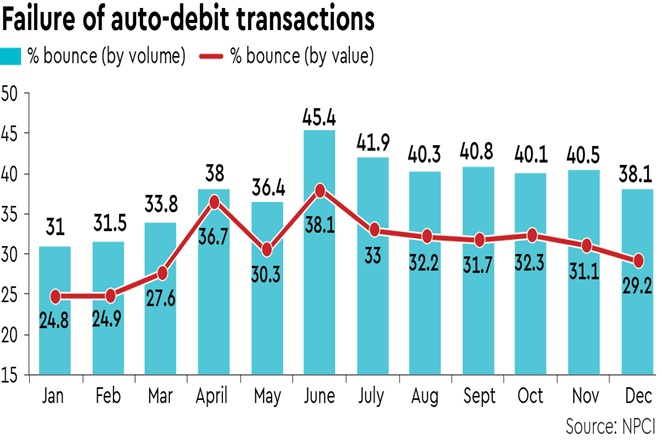 The failure rates of auto-debit transactions on the National Automated Clearing House (NACH) platform, many of which are EMI requests, eased in December, showed data released by the National Payments Corporation of India (NPCI).