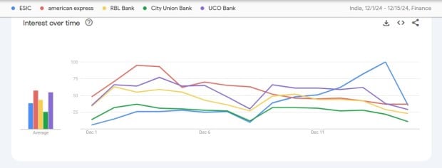 In December 2024, key banking developments in India attracted attention, including ESIC’s potential changes to wage ceilings, American Express’s sustainability initiative, and RBL Bank’s stock decline. City Union Bank saw a surge in share prices, while UCO Bank faced a drop despite earlier gains.Here’s a list of topics that’s trending in December so far-