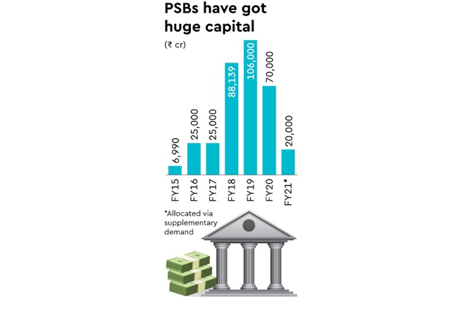 Having extended Rs 70,000 crore to state-run banks (including IDBI Bank) last fiscal and as much as Rs 3.1 lakh crore in the past five years through FY20, the government had refrained from providing for more capital in the Budget for FY21. However, the Covid-19 outbreak and consequent pressure on the banks’ balance sheets forced it to seek Parliamentary approval last month for a supplementary demand of Rs 20,000 crore to extend fresh capital.