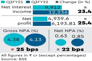Private-sector lender ICICI Bank on Saturday reported a 25.4% year-on-year (y-o-y) rise in standalone net profit to Rs 6,193.81 crore in the December quarter of FY22 on the back of a 23.4% y-o-y rise in net interest income (NII) to Rs 12,236 crore. The net interest margin (NIM) – a key measure of profitability – stood at 3.96%, down four basis points (bps) from 4% in the previous quarter.