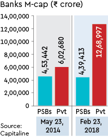 Yet, it remains true that PSU banks tend to have a higher proportion of NPAs, partly because they lent more to industry than the private sector banks did. But the government cannot afford to spend Rs 300,000-350,000 crore every decade on PSU banks. Nor is this the only value destruction. When prime minister Narendra Modi came to power, PSU banks had a market capitalisation of Rs 453,442 crore or around 43% that of the entire banking sector (see graphic). By February 23 this year, the PSU banks had lost a bit of this value and had a market capitalisation of Rs 439,413 crore. Private sector banks, however, saw their market capitalisation zoom from Rs 602,680 crore to Rs 1,268,997 crore over the same period, as a result of which the share of PSU banks in total bank market capitalisation fell from 42.9% to just 25.7%. Compared to a situation where PSU banks retained their market-capitalisation share, this means a notional loss of Rs 280,000 crore! And this is despite the government pumping in Rs 124,000 crore already since FY11 and planning another Rs 210,000 crore over the next two years.