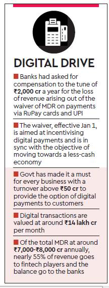 The government has turned down a request from commercial banks for compensation to the tune of Rs 2,000 crore a year for the loss of revenue arising out of the waiver of merchant discount rate (MDR) on digital payments through RuPay cards and Unified Payment Interface (UPI). The waiver, effective January 1, is aimed at incentivising digital payments and is in sync with the policy objective of moving towards a less-cash economy.