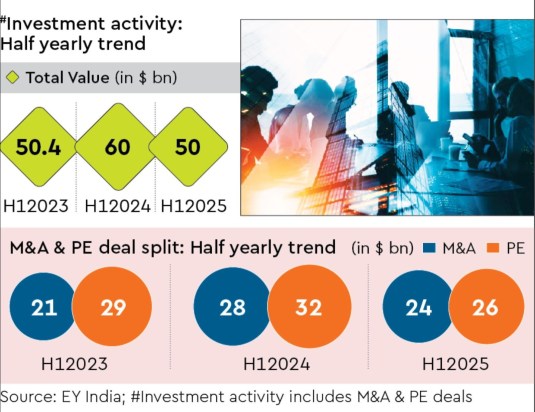 India Inc’s total investment activity in the first half of this year touched $50 billion across M&A and PE deals, 16% below the same period last year, but in line with the trend seen in H12023, when total investment activity stood at $50.4 billion, according to EY data. M&A and PE deals in H12025 were nearly evenly split at $24 billion and $26 billion each. The previous two years show a sharper tilt towards PE deals. (See chart)