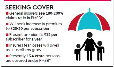 Government-owned insurance companies, mainly, are incurring losses of 80-100% on the prime minister’s accident insurance scheme, Pradhan Mantri Suraksha Bima Yojana (PMSBY). Compared with a premium of Rs 161 crore collected this year, insurance firms have disbursed claims of around Rs 290-320 crore. While they are planning to ask for doubling the premium levels for now — from Rs 12 per annum to around Rs 20-30 — even this may not be enough since similar insurance sold by these insurance companies can cost up to Rs 80 for a similar Rs 2 lakh cover albeit for individuals, and around Rs 45-50 for group insurance. A total of 13.4 crore persons have availed the PMSBY and, till March 5, a total of 20,249 claims were received; of these, 15,727 were settled. Launched in 2015, the insurance scheme gives a Rs 2-lakh cover for accidental death/permanent disability and Rs 1 lakh for partial disability. “In the past three years, claims from PMSBY have remained in the same range and the government had said that premium rate revision would be taken after three years,” said a senior official of a leading insurance company.
