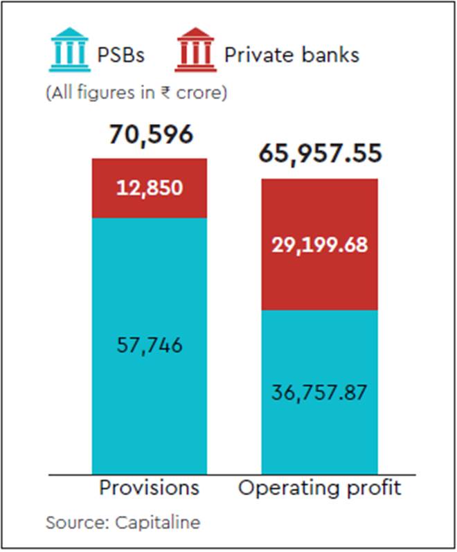 Data from Capitaline showed that while the public-sector lenders made provisions to the tune of Rs 57,746 crore, their aggregate operating profit stood at Rs 36,758 crore. This marks a 7.6% year-on-year (y-o-y) jump in provisions. Operating profit for the public-sector pack actually fell 24% y-o-y as state-owned lenders continue to be plagued by a high share of non-performing assets (NPAs), which do not yield interest.