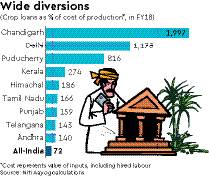 Crop loans to Chandigarh, Delhi and Puducherry — which are barely known for agriculture — stood at 1,997%, 1,173% and 816%, respectively, of their value of inputs (which comprises cost of farm inputs and that of hired labour) in FY18.