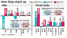 Public sector banks (PSBs) turned in a collective profit in Q1FY20 — the first time in more than two years — on the back of strong treasury gains. Nonetheless, the aggregate profit of Rs 3,948 crore was well below that of private player HDFC Bank’s Rs 5,568 crore.