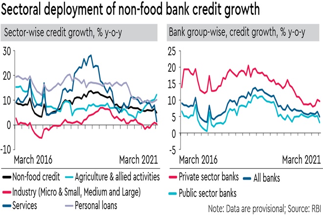 Among bank groups, public sector banks registered a non-food credit growth of 3.1% in March 2021, compared to 3.4% a year ago. However, the credit extended by private sector banks grew by 9.6%, compared to 13.9% a year ago.