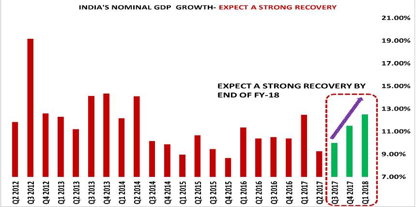 We are not in the camp that believes there is a structural downturn in the economy. We expect consumption to rebound. Multi-pronged attack on NPA mess would help revive investment. Though private investments are expected to remain muted but they will continue to show a gradual pick-up in coming quarters as business community adjusts to a post GST and post demonetized world. A strong global growth will continue to boost exports and RBI remains committed to keep CAD at a check, which means drag on GDP from external sector will remain low in the coming quarters. We expect government spending growth to hold up. All in all, we can see GDP growth rebound strongly by over 300 bps on a nominal basis.