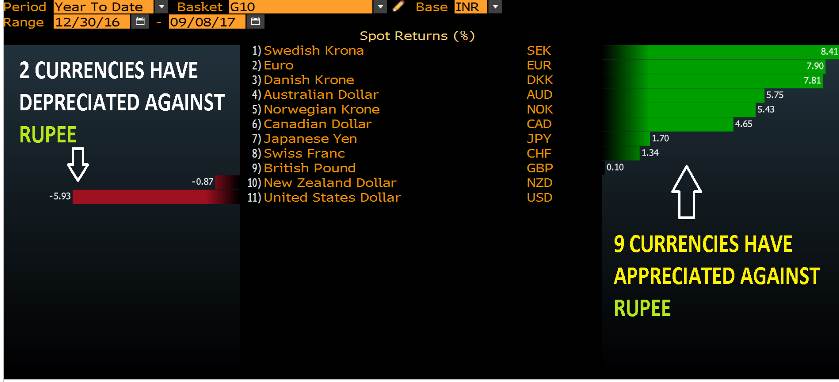 Where is the data that Rupee has become one of the strongest currencies in 2017? It has not only unperformed its EM peers but also lost ground against 9 of the 11 currencies in the developed block. Critics need to do a fact check. At the same time, we need to be more empathetic to RBI. RBI has faced the most challenging environment since demonetisation and US elections. They have not only got the currency circulation back on its feet in record time, they also managed to stabilise the money markets. At a time, when USD collapsed against other currencies, RBI has stood like a wall and absorbed the capital inflows, so that the current account deficit does not balloon and Rupee does not strengthen too much. India was fortunate to have Dr. Rajan as our governor and his contribution to policy making will always be remembered as he left after a glorious innings at RBI. However, it our belief that there is a risk that we may be giving credit where there is none due, when we say, that Dr. Rajan managed to keep the currency reasonably weak, but RBI, under Dr. Patel and others have failed to do so. Nothing can be further than the truth. A simple use of WCRS function of Bloomberg will clear the myth.