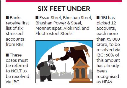 Bankers have received from the Reserve Bank of India (RBI) the first list of six stressed accounts that they must resolve via the Insolvency and Bankruptcy Code (IBC), senior executives familiar with the development said. The bankers added that the central bank had asked them to refer the cases to the National Company Law Tribunal (NCLT) within a fortnight. The companies, with a combined debt of Rs 1.6 lakh crore, include Essar Steel, Bhushan Steel, Bhushan Power & Steel, Monnet Ispat, Alok Industries and Electrosteel Steels. On Tuesday, the RBI said it had identified 12 stressed accounts that would need to be resolved via the IBC. These are accounts to which lenders have an exposure of more than Rs 5,000 crore and more than 60% of which have been recognised as NPAs. While lenders with exposure to these NPAs have been asked to resolve them using the IBC, they could also explore other methods of resolution, sources said. Bankers are expecting the names of six more near-bankrupt companies soon. “There is no time or no space for inaction. We have been given 15 days to act,” one of the bankers said.