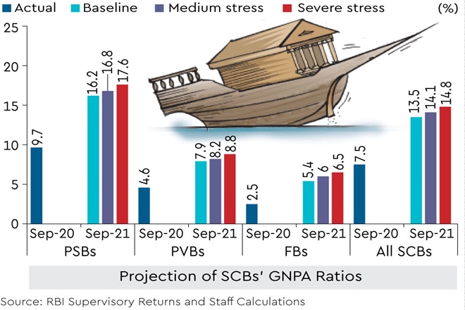 Loan losses in the banking sector, as measured by the gross non-performing asset (GNPA) ratio, could nearly double to 13.5% by September 2021 in a baseline scenario, and to as high as 14.8% in a severe-stress scenario resulting from the pandemic, the Reserve Bank of India (RBI) said on Monday. The GNPA ratio stood at 7.5% in September 2020.