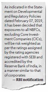 “As indicated in the Statement on Developmental and Regulatory Policies dated February 07, 2019, it has been decided that exposures to all NBFCs, excluding Core Investment Companies (CICs), will be risk weighted as per the ratings assigned by the rating agencies registered with SEBI and accredited by the Reserve Bank of India, in a manner similar to that of corporates,” the central bank said in a notification on its website.