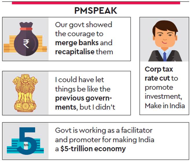 The Prime Minister also said the recent sharp cut in the corporate tax rate will promote investment and spur manufacturing in India. The government, he stressed, is working as an enabler, facilitator and promoter for turning India into a $5 trillion economy (over the next five years). “We are moving forward with reform and perform… We are working on connecting 15 crore households with piped water supply.”