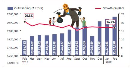 Within the retail segment, unsecured lending and credit cards had done much of the heavy lifting for banks in the last two years. According to a recent report by Nomura, for large banks, unsecured credit has been contributing 15-22% of incremental growth. However, this too is not going as steady as it was a few months ago. Credit card outstandings grew 27% y-o-y in February 2019, down from 34% in December 2018. In another category of unsecured lending — consumer-durable loans — banks have ceded almost the entire market to non-bank financiers. In February 2019, banks’ exposure to consumer-durable loans dropped 76% y-o-y to a mere `4,529 crore.