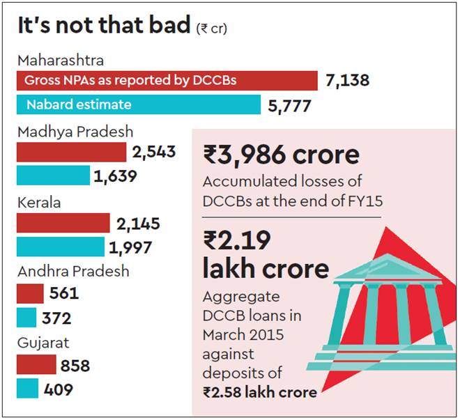 At the end of March 2015, the accumulated losses of DCCBs were Rs 3,986 crore, data from the Reserve Bank of India (RBI) showed. While state cooperative banks (StCBs) and DCCBs are registered under State Cooperative Societies Act of respective states and are regulated by RBI, National Bank for Agricultural and Rural Development (Nabard) conducts an inspection of their books. RBI data showed that while aggregate loans of DCCBs stood at Rs 2.19 lakh crore in March 2015 (latest available), their deposits were at Rs 2.58 lakh crore in the same period. Data from the RTI showed that in Andhra Pradesh, the aggregate bad loans reported by the DCCBs stood at Rs 561 crore in FY16, while Nabard found them to be Rs 372 crore.