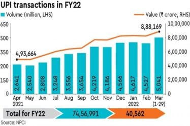 April 1, 2022: The value of Unified Payments Interface (UPI) transactions crossed $1 trillion in FY22, showed data released by the National Payments Corporation of India (NPCI). As on March 29, the value of UPI transactions for the year added up to Rs 83.45 trillion, which works out to roughly $1 trillion.