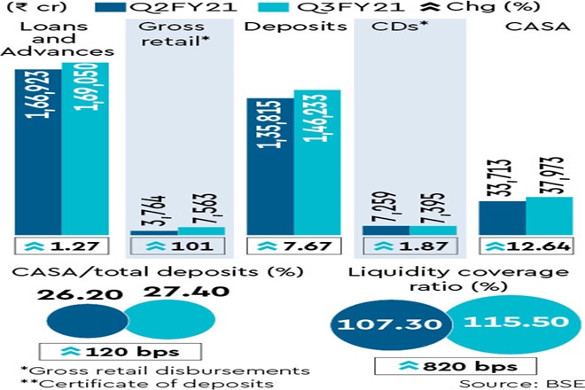 The certificate of deposits (CDs) grew 1.9% to Rs 7,395 crore from Rs 7,259 crore in the preceding quarter. The current account and savings account (CASA) deposits grew 12.6% to Rs 37,973 crore, compared to Rs 33,713 crore in the September quarter. Similarly, the proportion of total CASA deposits to total deposits grew 120 basis points (bps) to 27.4% in the December quarter, compared to 26.2% in the previous one.