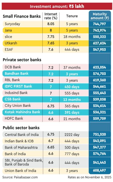 Deposits with predefined tenures will helpthem align their short- to medium-term financial goals and get a higher maturity amount in the long run. Depositors can benefit from changing interest rates. If rates rise, they can reinvest the matured deposits at higher rates. If rates fall, only a portion of their money is affected, as the longer-term deposits were locked in at higher rates earlier.