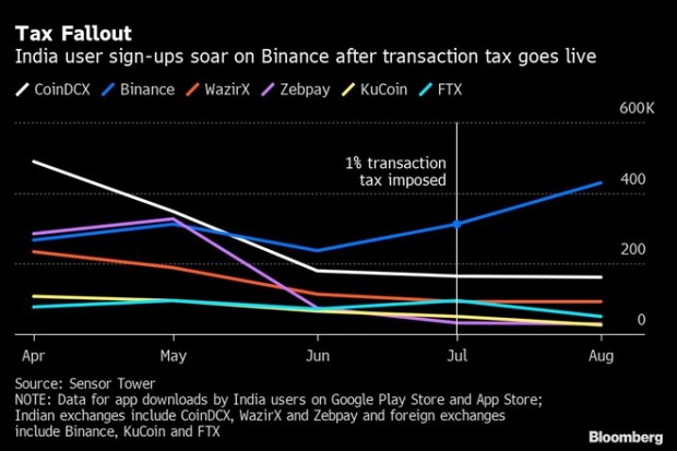 Binance Holdings Ltd.’s billionaire Chief Executive Officer Changpeng Zhao is tightening his grip on India’s market for cryptocurrency trading in the fallout from a major tax change. Downloads of Binance’s app in India jumped to 429,000 in August, the highest this year and almost triple that of runner-up CoinDCX, data from market intelligence firm Sensor Tower show. Only Binance among the top exchanges achieved higher downloads in India compared with July.