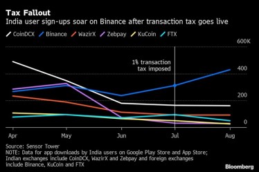 Binance Holdings Ltd.’s billionaire Chief Executive Officer Changpeng Zhao is tightening his grip on India’s market for cryptocurrency trading in the fallout from a major tax change. Downloads of Binance’s app in India jumped to 429,000 in August, the highest this year and almost triple that of runner-up CoinDCX, data from market intelligence firm Sensor Tower show. Only Binance among the top exchanges achieved higher downloads in India compared with July.