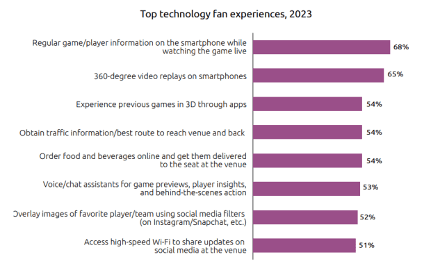 According to the report, fans value their smartphone as a companion to enhance the viewing experiences, whether at home or at the venue. Over 68% of fans have used a mobile device to receive regular game/player information while watching the game live, and 65% for 360-degree video replays. 68% of fans would also like to try using their mobile device to get player information, live stats etc. by pointing at players while present at the venue, using augmented reality. Finally, fans would also be interested in enhanced sports experiences such as in the metaverse. Two thirds of them, for example, would be interested in purchasing digital merchandise to wear in virtual worlds or attending games, and socialising virtually with fans or players in a virtual sports venue.