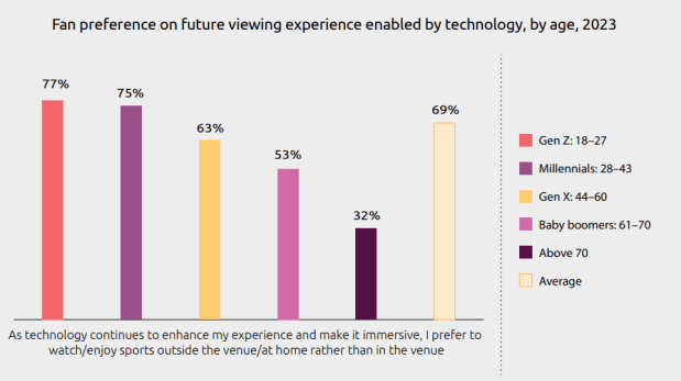 Capgemini Research Institute released a report titled ‘A whole new ball game: Why sports tech is a game changer’. As per the company, the technological advances of the last three years have improved the experience for sports fans at home but have been less impactful for those visiting the grounds. According to the report, as technology continues to enhance the viewing experience and make it more immersive, 77% of Gen Z and 75% of millennials say they prefer to watch sports outside of venues, compared to 53% of baby boomers and 32% above 70 years old.