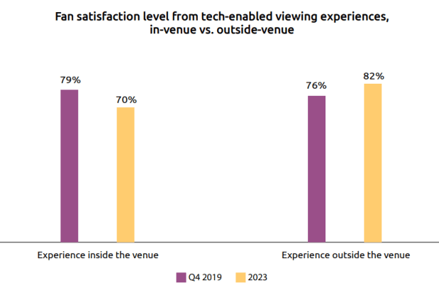 Moreover, mobile devices have risen to the fore, although fans still prefer TV for watching games, suggesting that smart devices provide a supplementary option for consuming sports, on-the-go or ‘multi-screening’. In 2019, 40% of fans picked smartphone screens as a preferred device to watch games, versus 70% at present. Streaming platforms as well as social media have also seen a boost in viewing with 39% of fans mentioning streaming platforms as a preferred option for watching sports which has nearly doubled to 75%. Social media has jumped from 44% in 2019 to 64% in 2023, driven by younger generations.