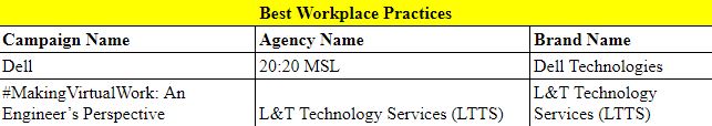 WATConsult won the special award for Agency of the Year. As for Best Small Budget Marketing Campaign, Licious took home the trophy for their ‘Money Back Guarantee’ campaign. The award for ‘Best Workplace Practices’ was bagged by Dell Technologies and L&T Technology Services.