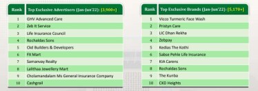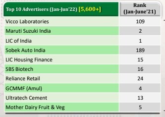 Maruti, LIC, Amul and Mother Dairy were the advertisers that remained in the list of top 10 of H1 of both Y2022 and Y2021. Six out of 10 were the new entrants in top 10 advertisers’ list on radio. Vicco Vajradanti Paste topped the brands of Jan-Jun’22 followed by Vicco Turmeric Face Wash. During Jan-Jun’22, there were total of over 6,900 brands present on radio. Three out of top 10 brands were from services sector and two were from retail, BFSI and personal care/personal hygiene sector.