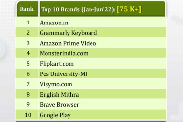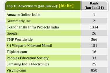 Amazon Online India’s brand Amazon.in emerged as the most advertised brand followed by Grammarly Keyboard. Amazon’s Prime Video occupied the third position. As per the data, top 10 brands accounted for 11% share of digital ad volumes. During Jan-Jun’22, there were more than 75,000 brands present on digital.