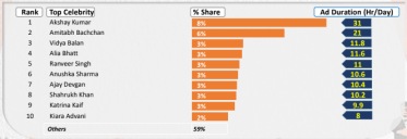 Akshay Kumar was the most visible star, with an average visibility of 31 hours per day across all channels, followed by Amitabh Bachchan with 21 hours per day through TV sponsorships. There was an equal number of male and female celebrities in the top 10 list.