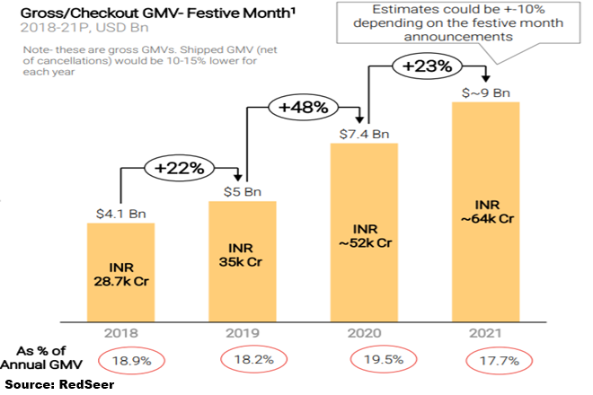 And the festivities have begun and so have the discounts. Walmart owned Flipkart has rolled out its Big Billion Days sales from October 3- 10, while its archrival Amazon’s month-long Great Indian Festival started on the same day. Last year, E-commerce players clocked $7.4 billion worth of gross merchandise value (GMV) during the festive month, according to data released by research firm RedSeer. With an increase of 23%, GMV is expected to cross $9 billion this year. In addition, the festive sales GMV is estimated to touch $4.8 billion in the first week itself.