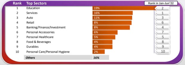 The education sector topped with a 19% share of ad space followed by services with a 16% share during January-June 2023. Services held the top spot during the same period in 2022 while education followed closely. Top three sectors together accounted for more than 45% share of ad space in print.