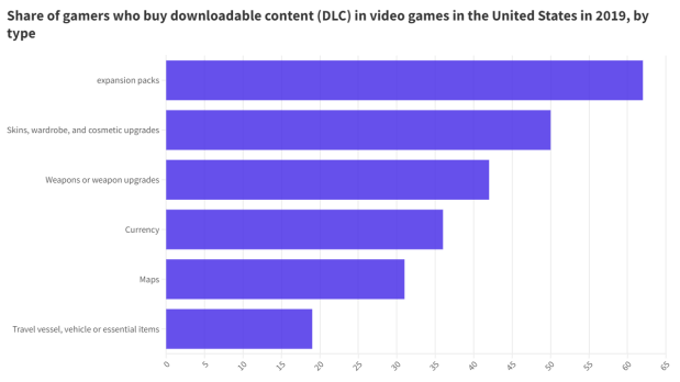 Downloadable content is a way of enhancing the video gaming experience for the players by giving them access to exciting new content which can range from purely aesthetic changes to upgrades to characters and items revealed data from market research firm Statista. During a 2019 survey of gamers, it was found that 62% of gamers spent money on expansion packs to gain more content to enhance the original game, stated the report.
