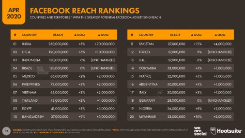 In March 2020, an additional 76 million people saw adverts on Facebook, as compared to December 2019. A substantial part of the growth was fuelled by strong gains in India, with a potential reach of 280 million, an increase of 20 million since January.