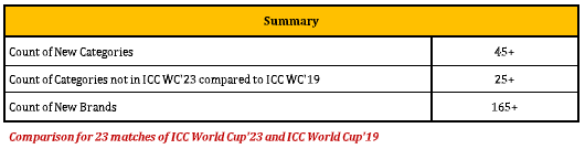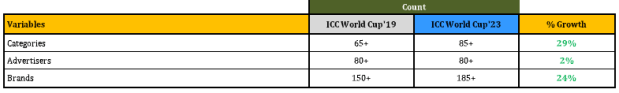 The ongoing tournament (ICC Men’s Cricket World Cup 2023) witnessed more than 85 categories as compared to 65 categories in the previous edition of the ICC Men’s Cricket World Cup in 2019. Categories witnessed a growth of 29% from 2019 to 2023. The count of advertisers remained similar for both tournaments having more than 80 advertisers, witnessing a two percent growth. More than 185 brands advertised in the first 23 matches of ICC Men’s Cricket World Cup 2023.