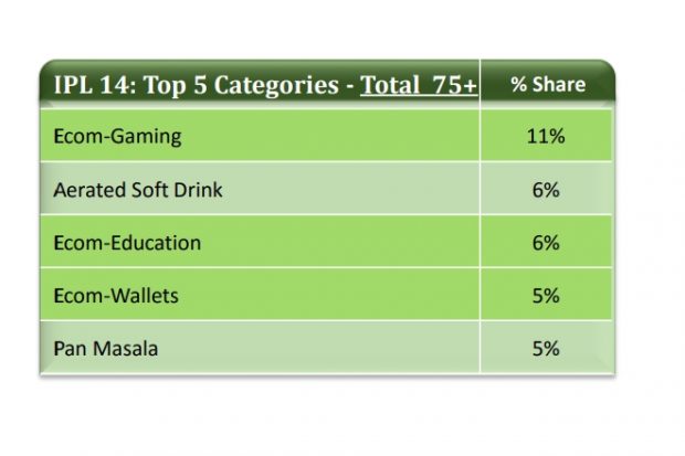 Following last year’s trend, ecom-gaming emerged on top ads the most advertised category with 11% share. Following this was Aerated Soft Drink and Ecom-Education with 6% share of the ad pie. During the first 22 matches of the IPL 14, the top five categories collectively accounted for more than 30% of overall ad volumes.