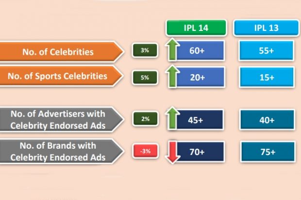 During IPL 14, overall number of celebrities’ endorsements saw a rise of 3% when compared to IPL 13. Similarly, number of sports personalities grew by 5% during the first 22 matches of IPL 14. However, number of brands using celebrity endorsement fell by 3% whereas advertisers grew by 2% in first 22 matches of IPL 14 compared to IPL 13.