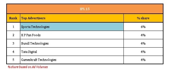 During the first five matches, the top five categories’ list had four categories from the e-commerce sector (including gaming, online shopping, education and wallets) with more than 30% share of ad volumes in IPL 15. The top five categories together had 40% share of ad volumes in IPL 15. Interestingly, three out of the top five categories were common between IPL 14 and 15 including e-com gaming, pan masala and e-com education. Meanwhile, the top five advertisers contributed more than one-fifth share of ad volumes during five matches of IPL 15. Sporta Technologies was the only common advertiser among the top five advertisers during IPL 15 and IPL 14. Sporta Technologies was followed by K P Pan Foods, Bundl Technologies, Tata Digital, and Gameskraft Technologies.