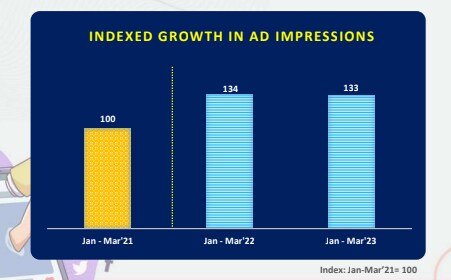 Highlighting about the leading web publisher and app, the report stated that YouTube with 19% impression leads as both a web publisher and an app in terms of ad impressions in January-March 2023 quarter. While among Apps, again YouTube lead the list with 17% share followed by Cricbuzz with seven percent. Furthermore, during January-March 2023, YouTube alone had 36% of ad impressions.