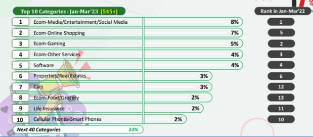 Additionally, more than 240 categories registered positive growth. Ecom-Online shopping lead the top 10 growing categories in January-March 2023 as compared to the same period last year, based on the difference in ad impressions. Hosiery category witnessed a growth of 12 times while aerated soft drinks and airlines grew 6.1 times and 5.7 times respectively.