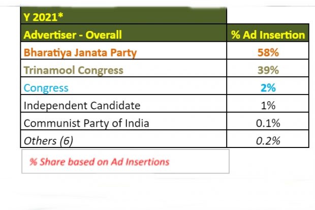 Across TV, radio and print mediums, Bhartiya Janta Party (BJP) lead the charts with more than 50% share of political ad insertions in 2021 followed by regional political party Trinmool Congress (TMC) with 39% share. It should be noted that in 2016, ad insertion’s share of local party Trinamool Congress was more than 50%. Overall, the top five political parties had 99% share of political ad insertions during 2021 with BJP’s ad insertions rising by 20% during 2021 over 2016.